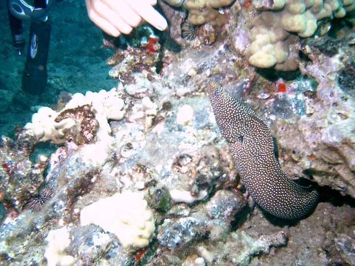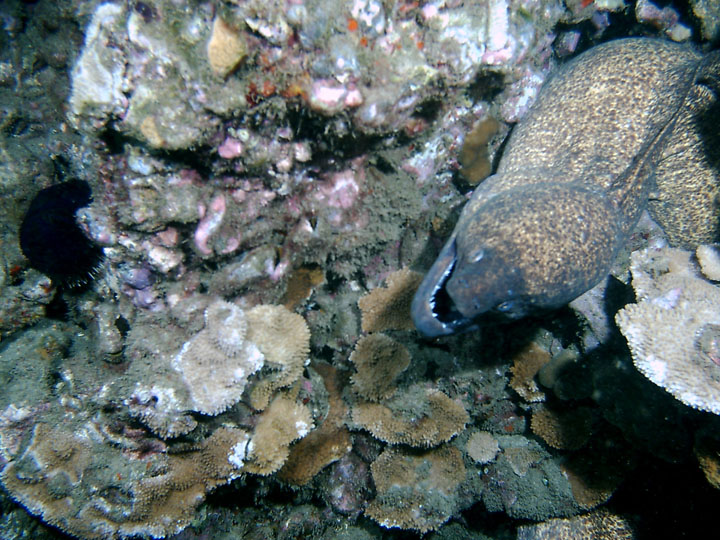 | Huge Moray This is the biggest Moray I've ever seen. They look ferocious, but they're really not that bad. It's not a good idea to try to feed or touch them though. |