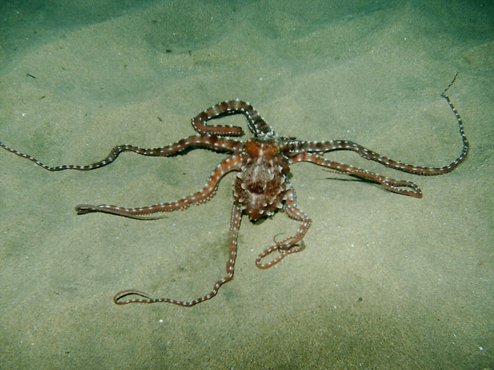 | Octopus This was relatively large (for Maui), about three feet from end to end. This was a night dive at Ulua Beach. |
