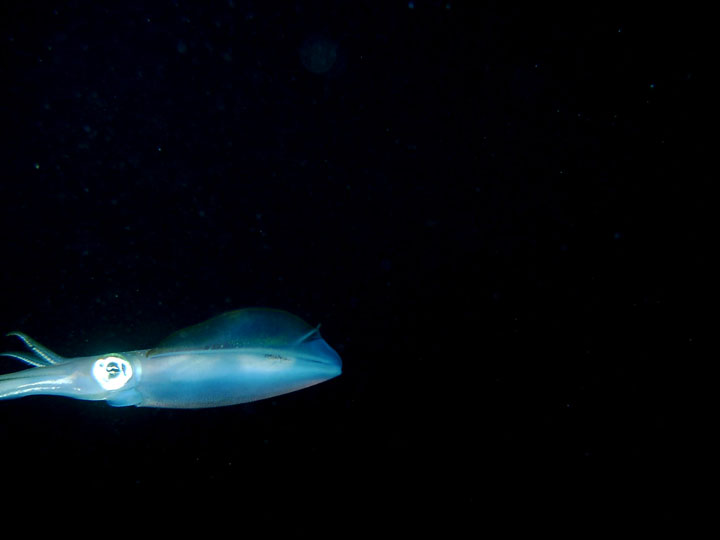 | Squid This was another night dive. He was near the rocks in about 15 fsw. As I got closer, he started flashing white and red, just like in National Geographic. You can see a bit of the red on the bottom. |